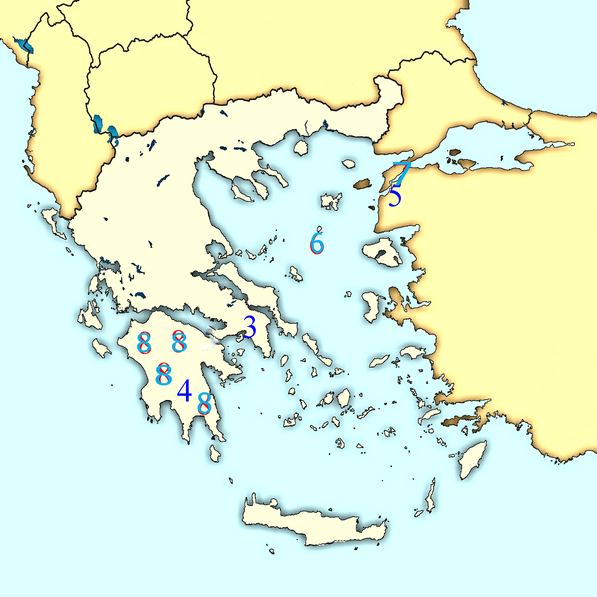 3-8. Label the cities (3,4,5) and geographic features (6,7,8). Spelling counts for 6-8.