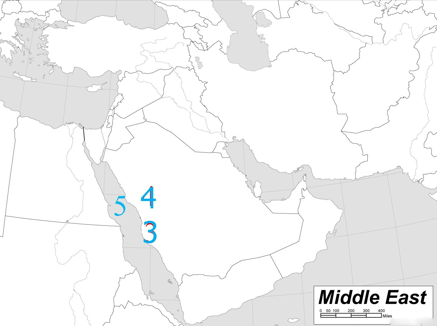 3-5. Label the cities (3,4) and body of water (5). Spelling counts.