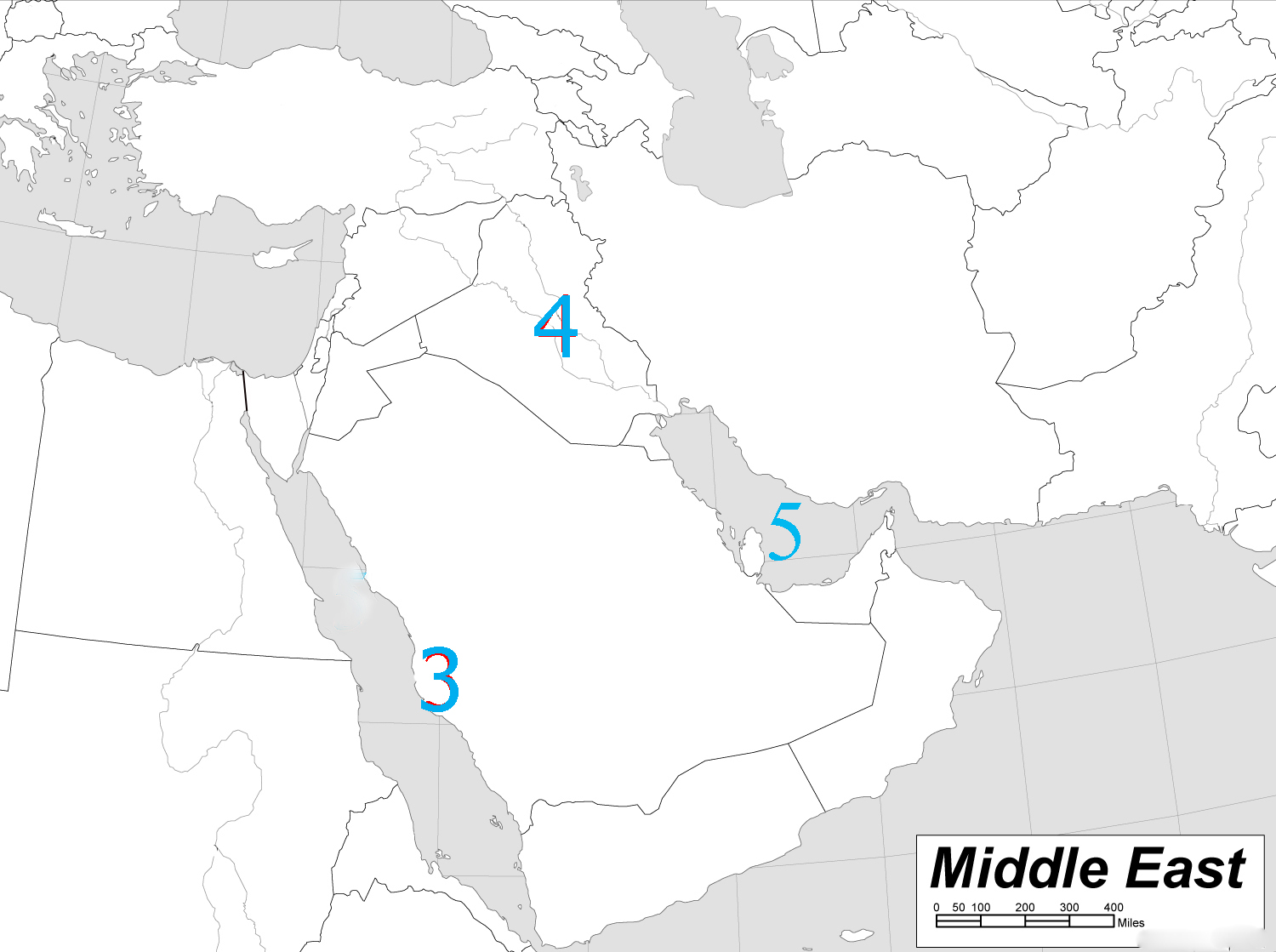 3-5. Label the cities (3,4) and body of water (5). Spelling counts.